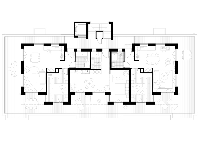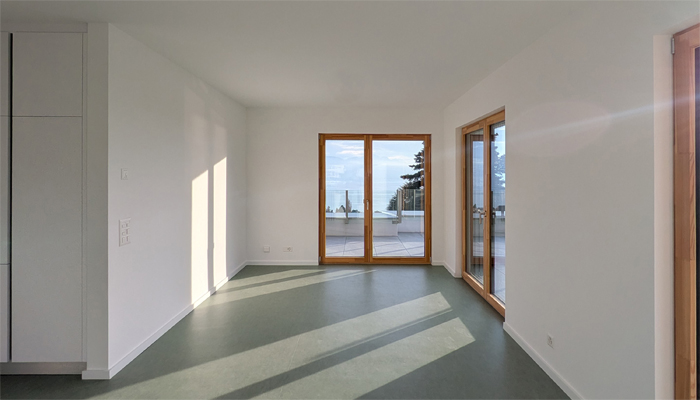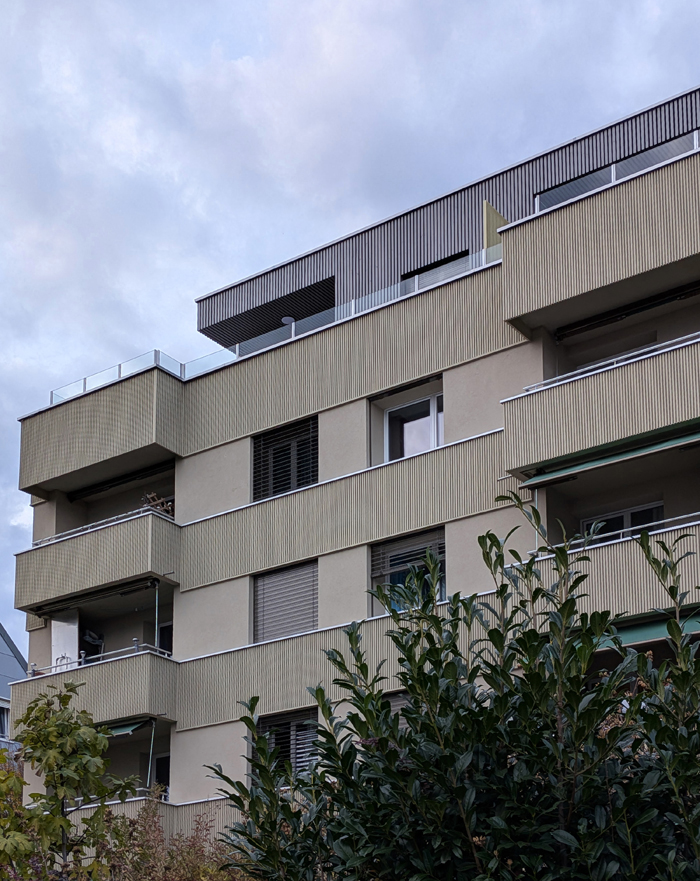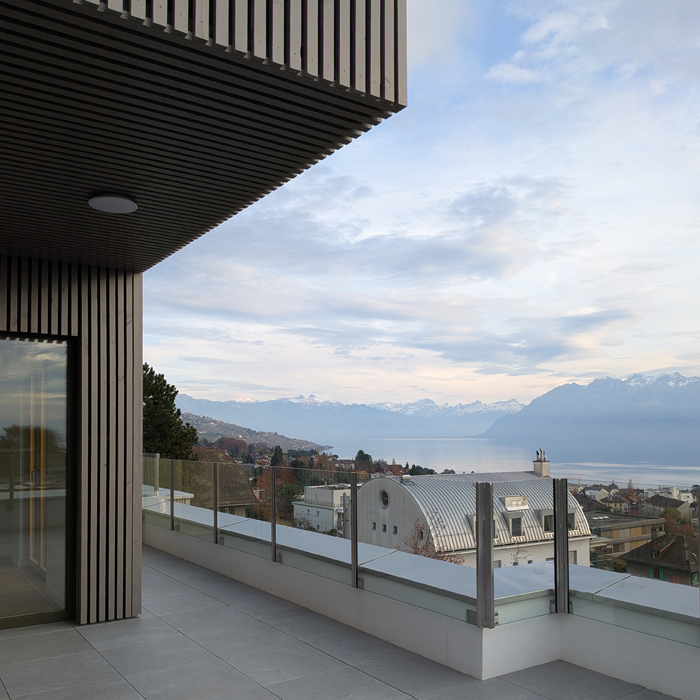 La surélévation, conçue comme un attique en structure bois préfabriquée, prolonge naturellement le volume existant. Elle accueille trois appartements spacieux, ouverts sur de larges panoramas sur le lac et le Lavaux. Chaque logement dispose de généreux balcons et d’espaces de vie modulables, pensés pour favoriser l’appropriation et l’adaptabilité des usages.